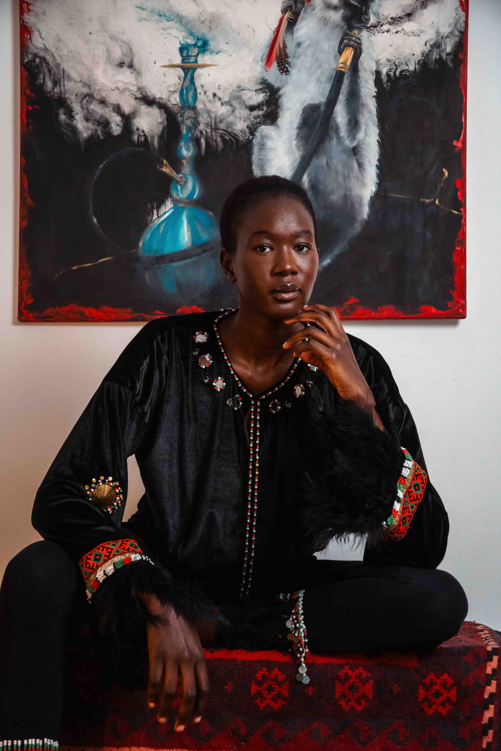 A Black velvet kaftan top, with an open front. Hand beaded work and embellishments on the collar, sleeves and cuffs, edged with feathers. Spruce up your evening with a timeless piece.
