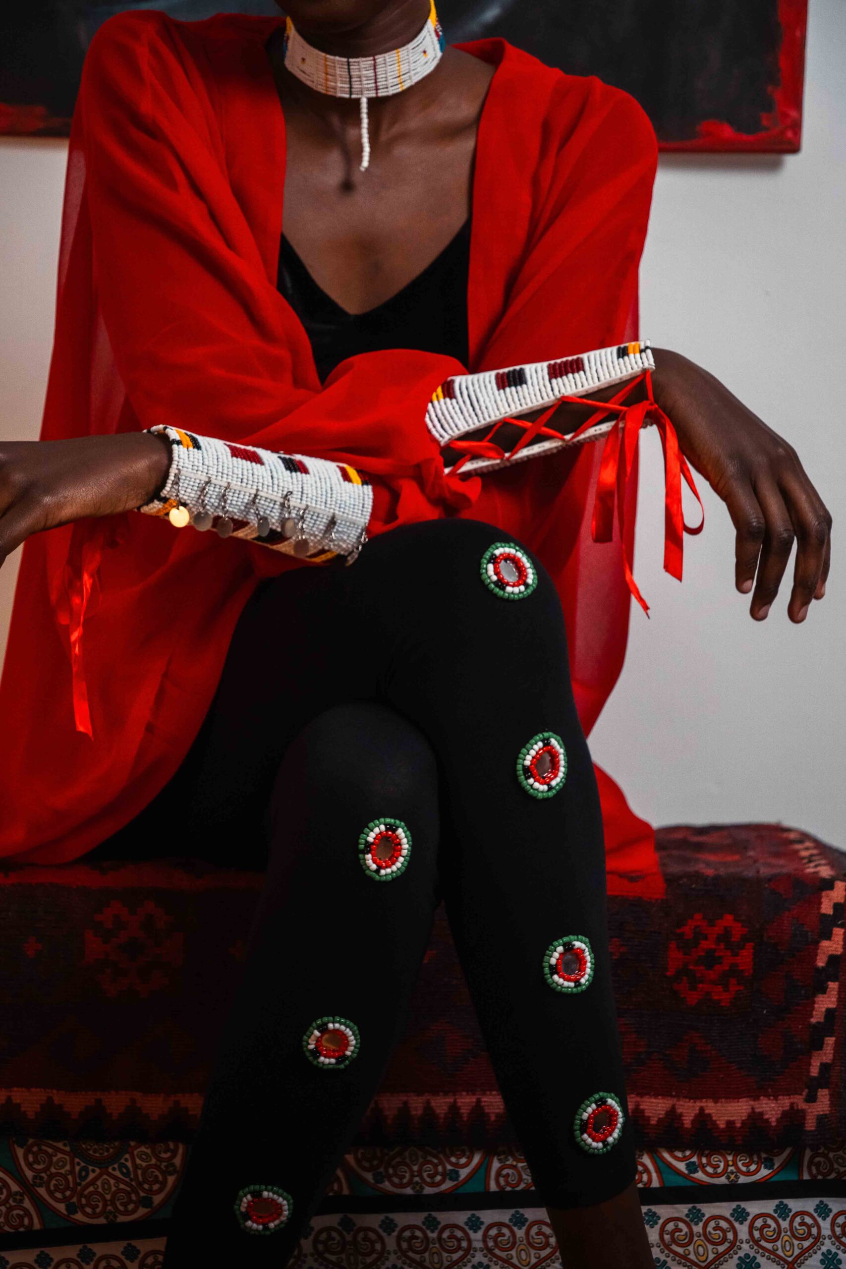 Leggings with hand beaded embellishments with silver sequins and the traditional Kenyan colour beads