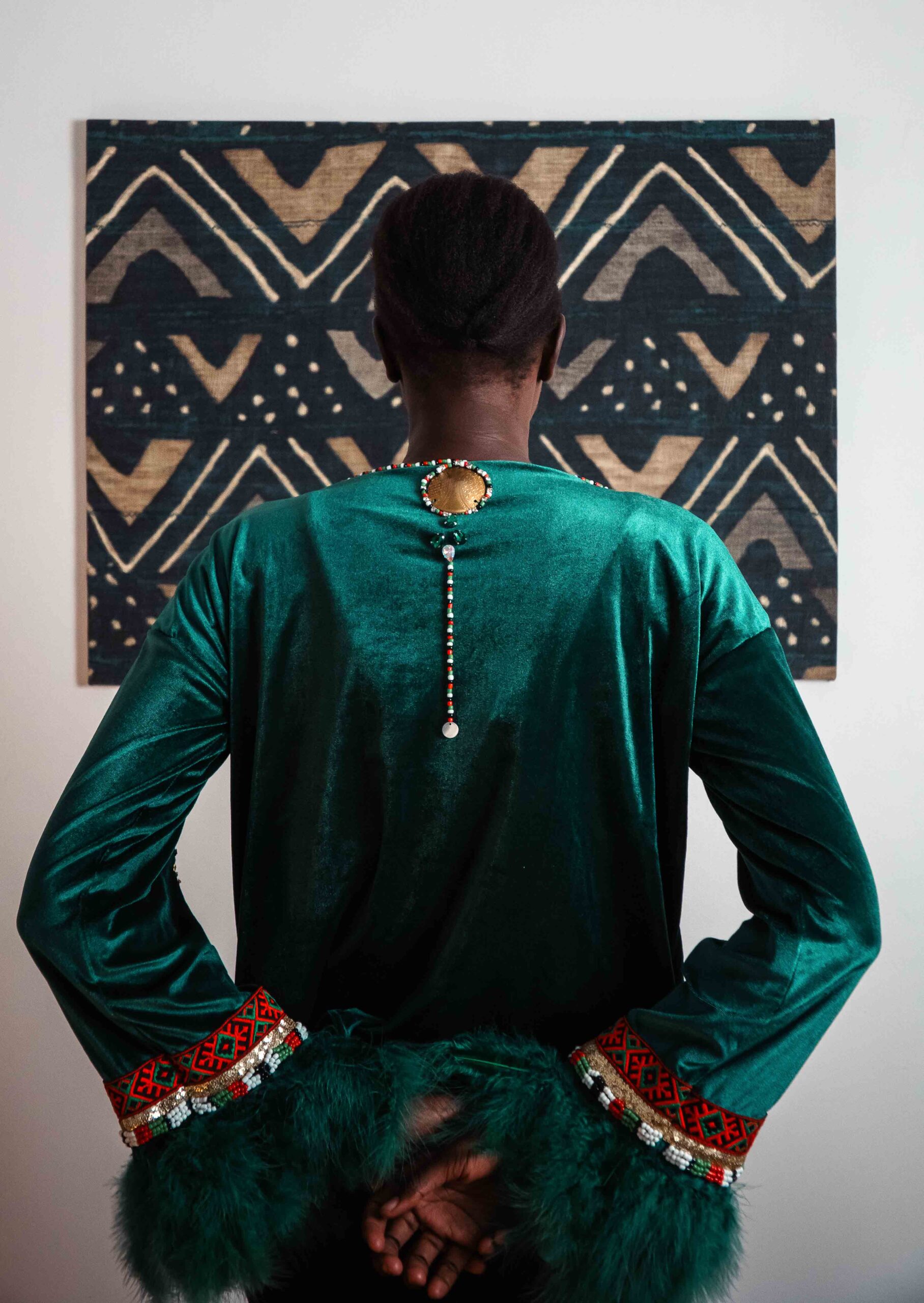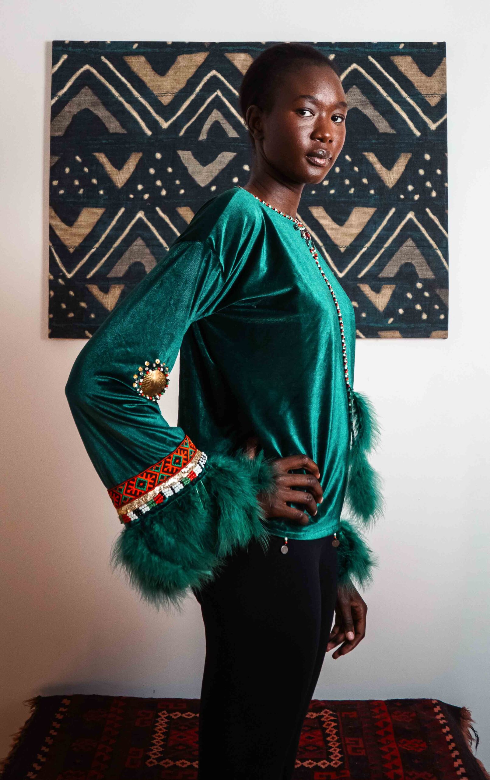Green velvet short kaftan top. Embellished handwork on the collar, sleeves and cuffs, edged with feathers. A timeless piece for any occasion